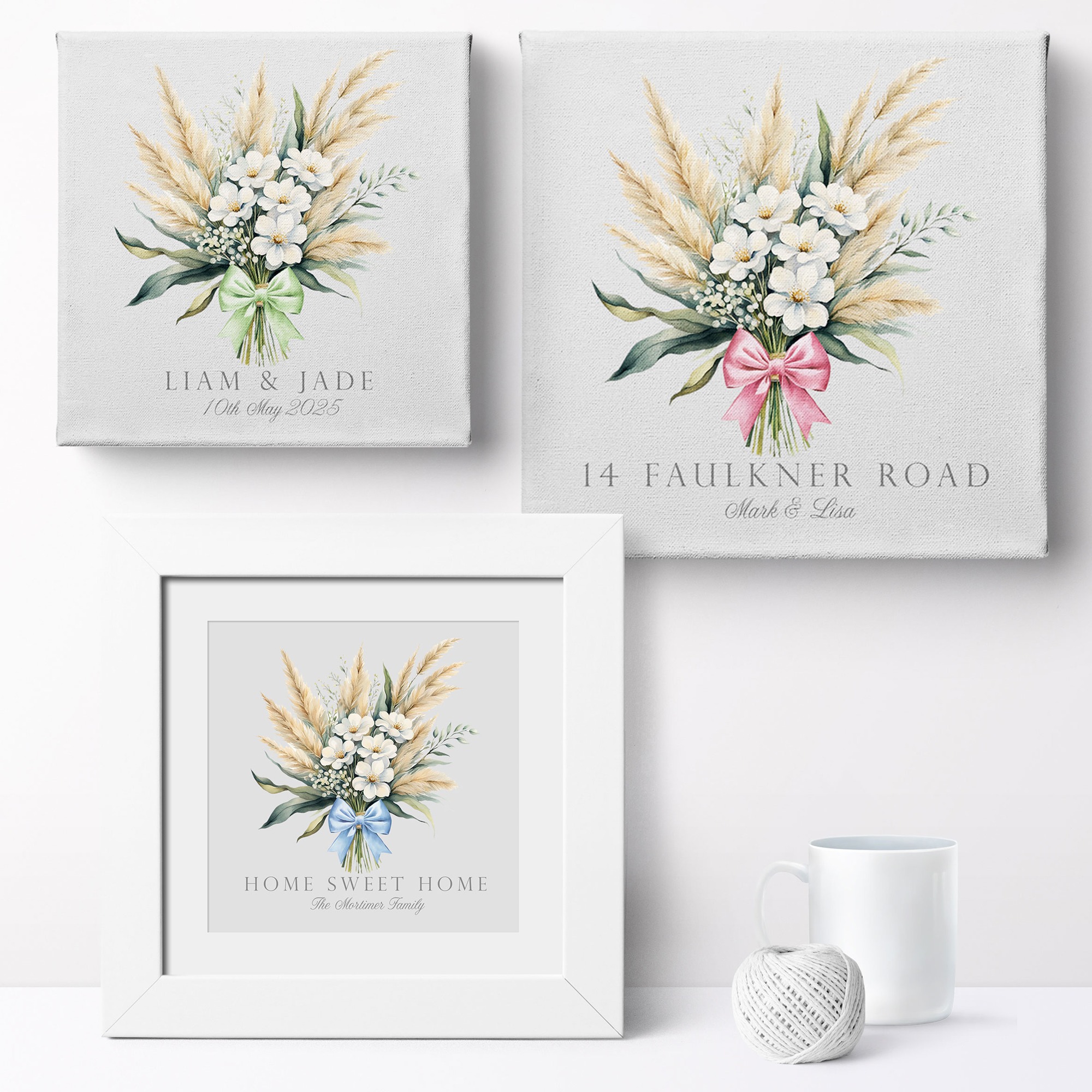 This elegant Bouquet print has a soft, romantic feel and is perfect for a housewarming, anniversary or wedding. The artwork features delicate floral illustrations and your own wording (line 1 will appear in all capital letters - line 2 will appear in upper and lower case). With a soft and neutral background suitable for any decor, the bouquet's bow is available in a choice of three colours to suit the recipient’s style. This delightful botanical print will look lovely in any room, and will be a cherished gift whatever the occasion - whether you're celebrating a new home, marking a wedding day, or simply showing someone you care.